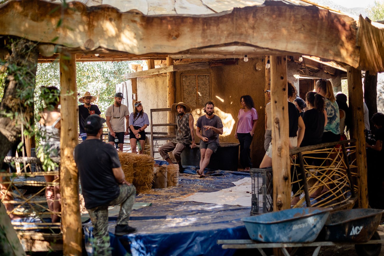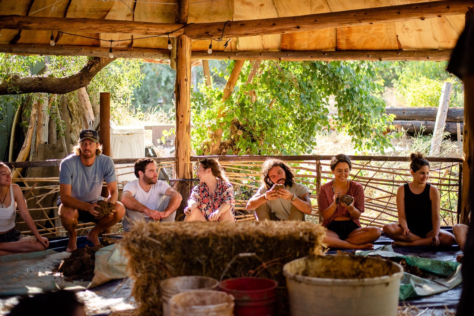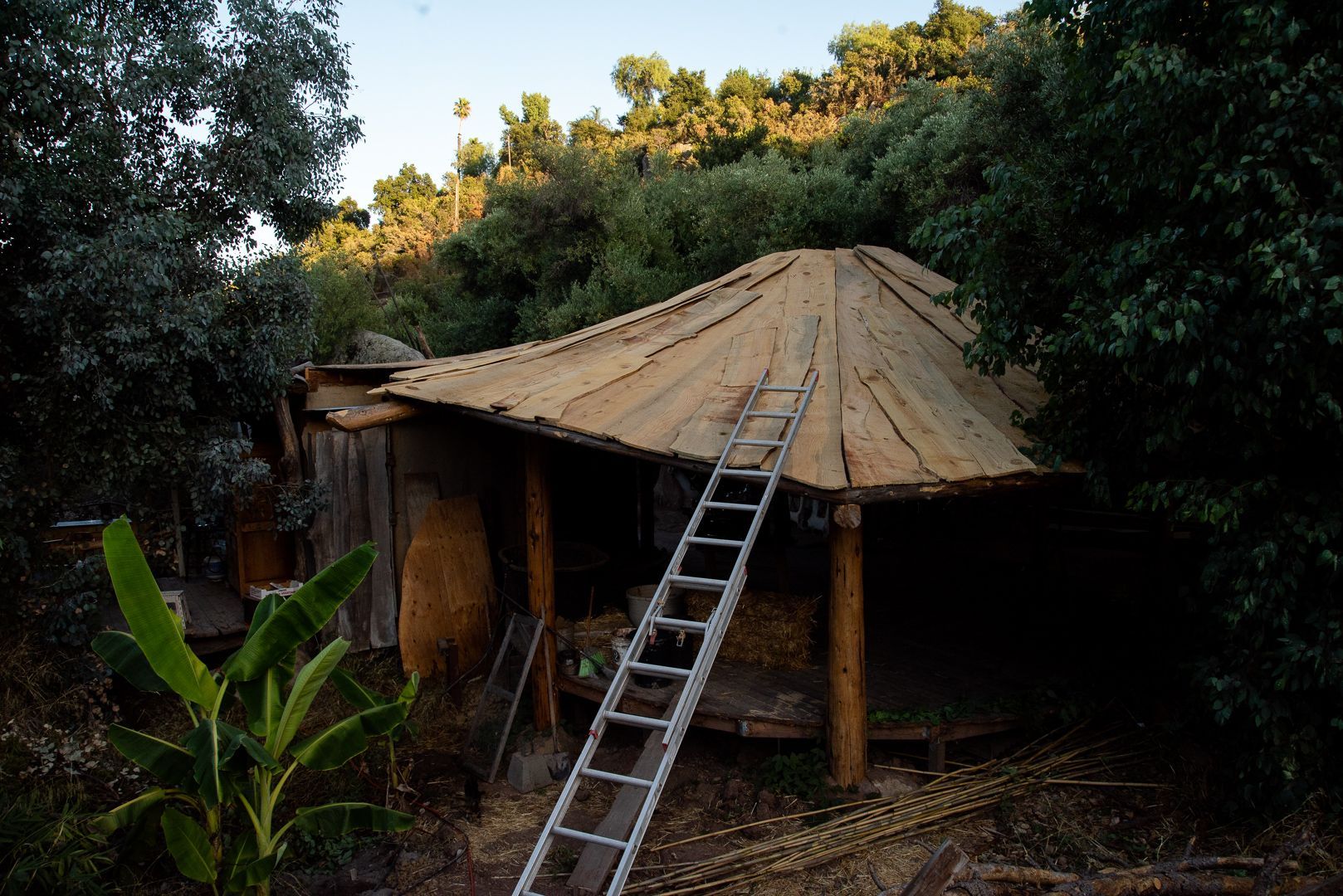 mycelium blocks, on-site clay, on-site cedar, salvaged windows, pond liner