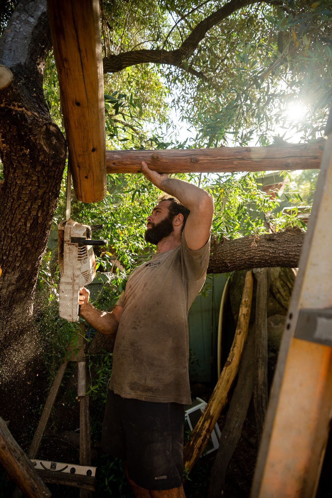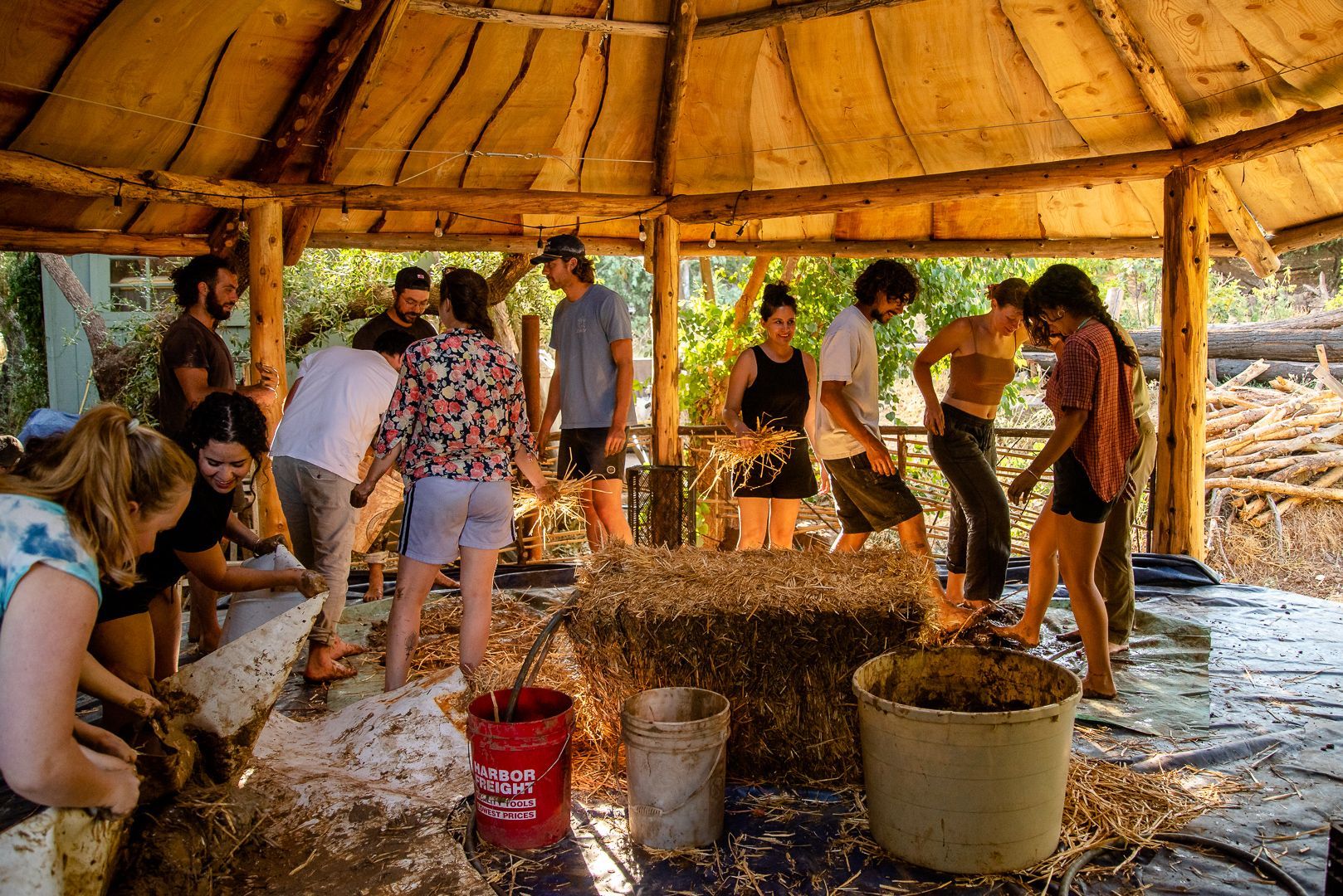 site harvested and milled pine, pine needles, onsite clay and sand, historic new orleans urbanite, pond liner